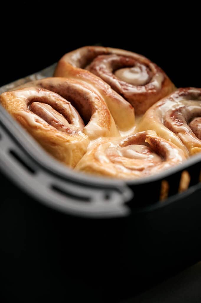 Reheat the refrigerated cinnamon rolls in the air fryer for 5 minutes at 180°C/356°F until they’re nice and warm.