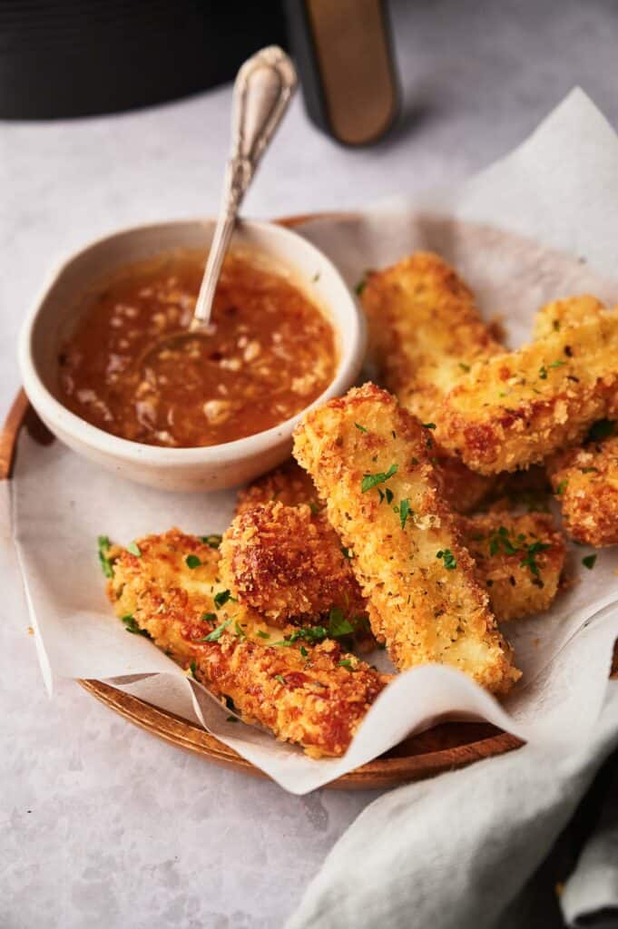 When cooked, use tongs to remove the homemade mozzarella sticks from the basket and transfer them to a serving plate.