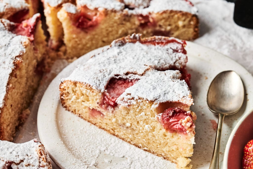 It’s lovely on its own, but a dollop of freshly whipped cream or a scoop of vanilla ice cream alongside a slice makes it feel really special. For brunch, I like serving it with a fruit salad heavy on the berries to keep the strawberry theme going, or alongside a pitcher of fresh lemonade for a bright, summery spread.