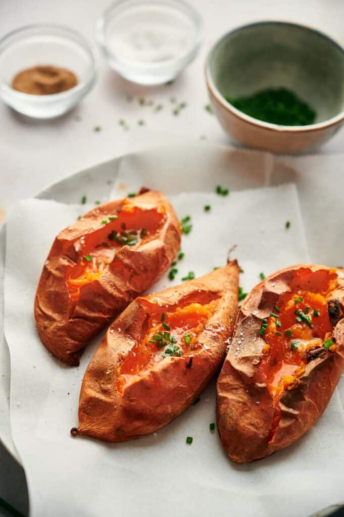 Remove them from the air fryer, and serve baked sweet potatoes immediately with butter, salt, and pepper, a sprinkling of chives, or your favorite toppings!