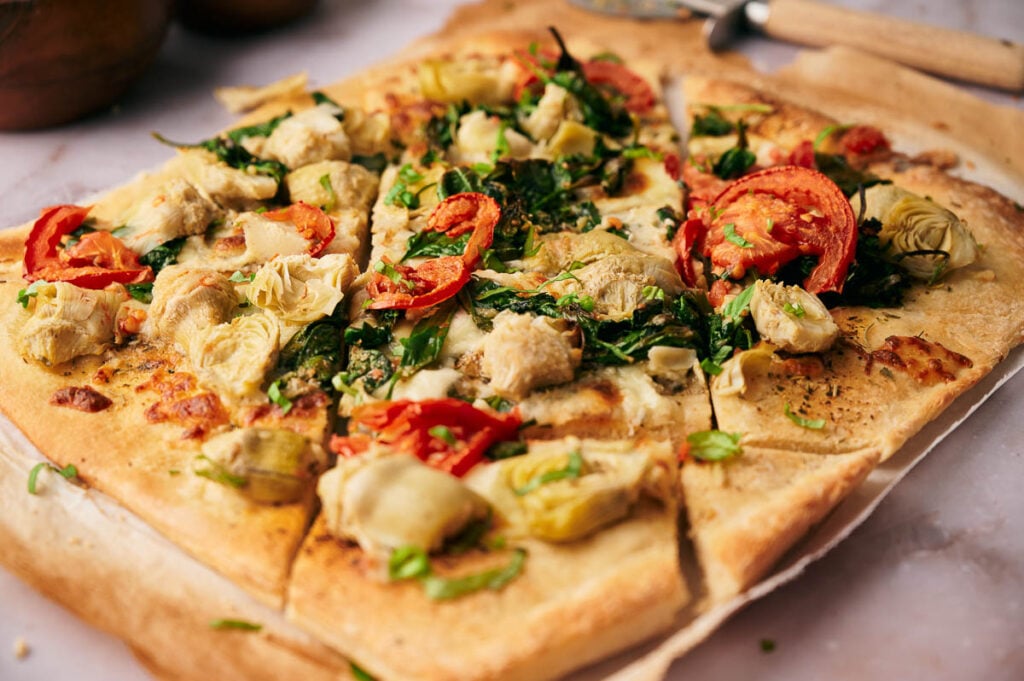 Making artichoke pizza at home is easier than you think, and the combination of garlicky spinach and tangy artichokes creates a topping you won’t find at your usual pizza place.