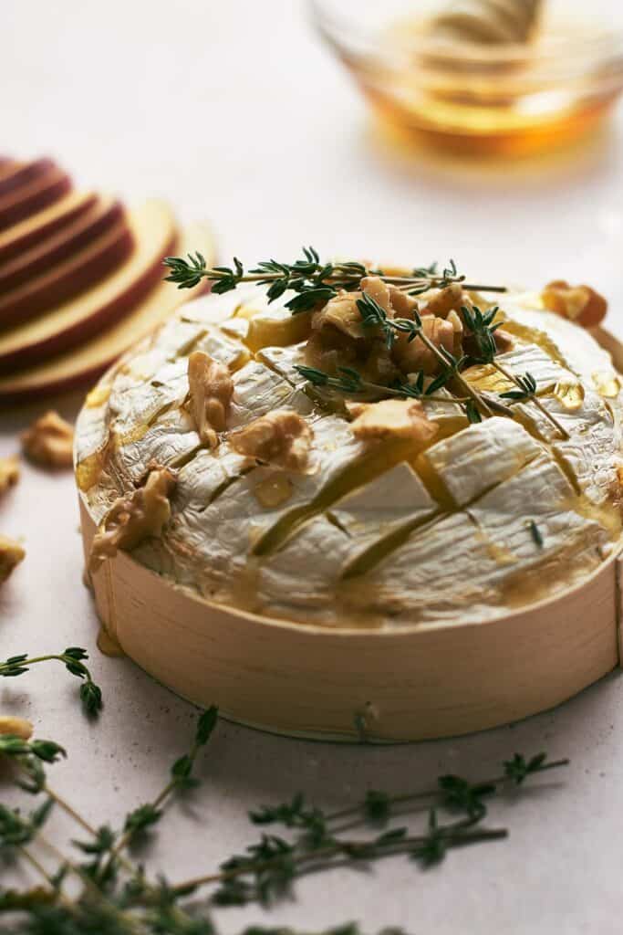 - Remove from the oven and place on a serving plate (leave it in the box), drizzle honey, scatter walnuts and garnish with a sprig of fresh thyme. Serve immediately and enjoy!2 tablespoons honey or maple syrup, 2 tablespoons walnuts, Thyme sprig, Crostini, bruschetta, French bread, or crackers, Grapes or apple slices
