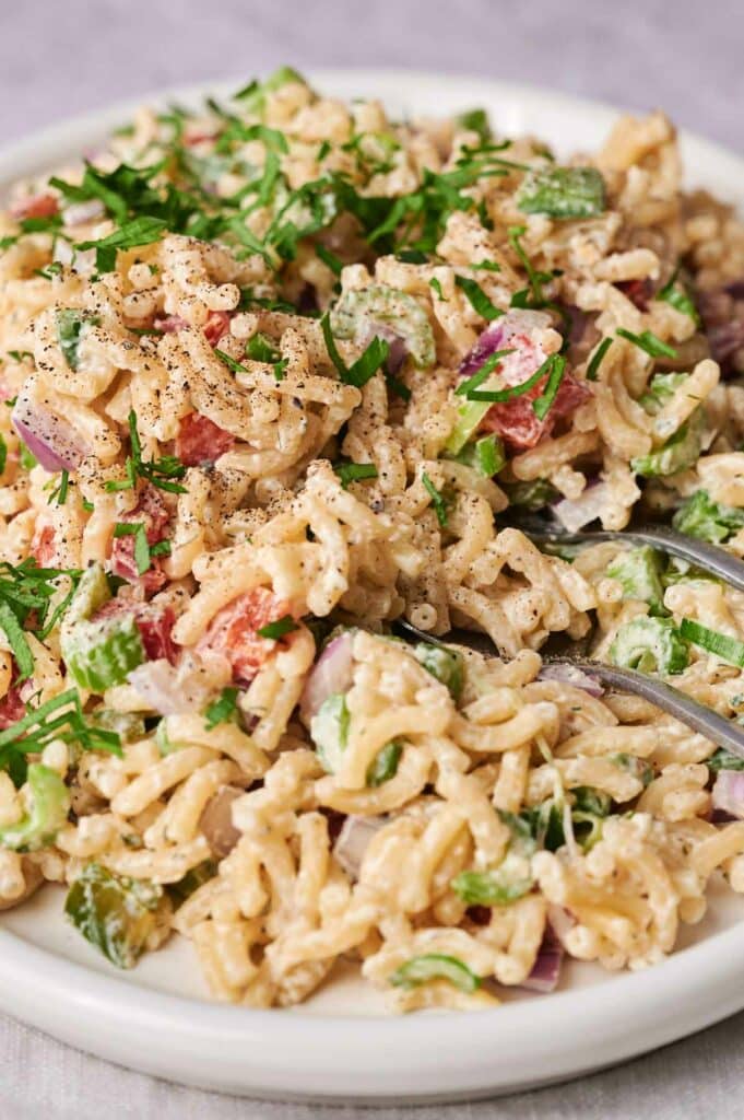 - Blank Canvas for Creativity: This isn’t your grandma’s (or kid’s cafeteria) macaroni salad. This recipe is a springboard for your personal touch. Love veggies? Pile them in! Craving protein? Toss in veggie chicken!