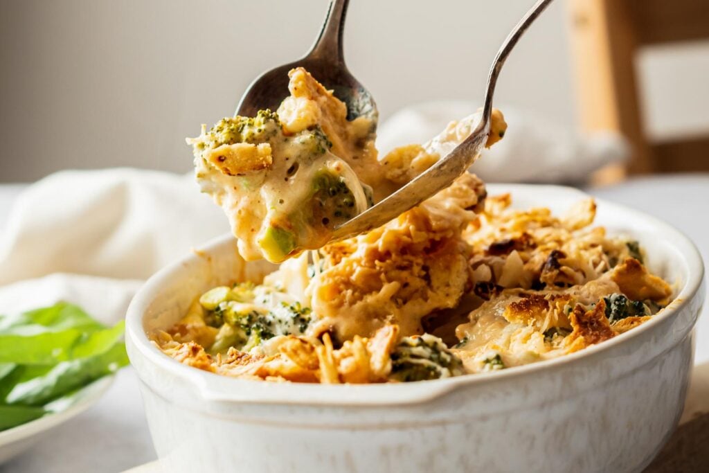 Broccoli cheese casserole is such a popular potluck and family gathering dish, so if you’re transporting it, let it cool slightly, then cover the dish tightly with foil or a silicone casserole lid. Then, pack the covered dish in an insulated casserole carrier so it stays hot until you arrive.