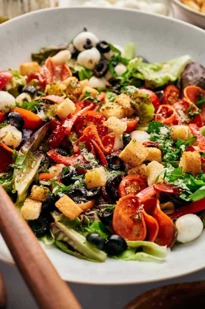 Delicious homemade pizza salad in a serving bowl, with wooden serving spoons and Italian dressing.