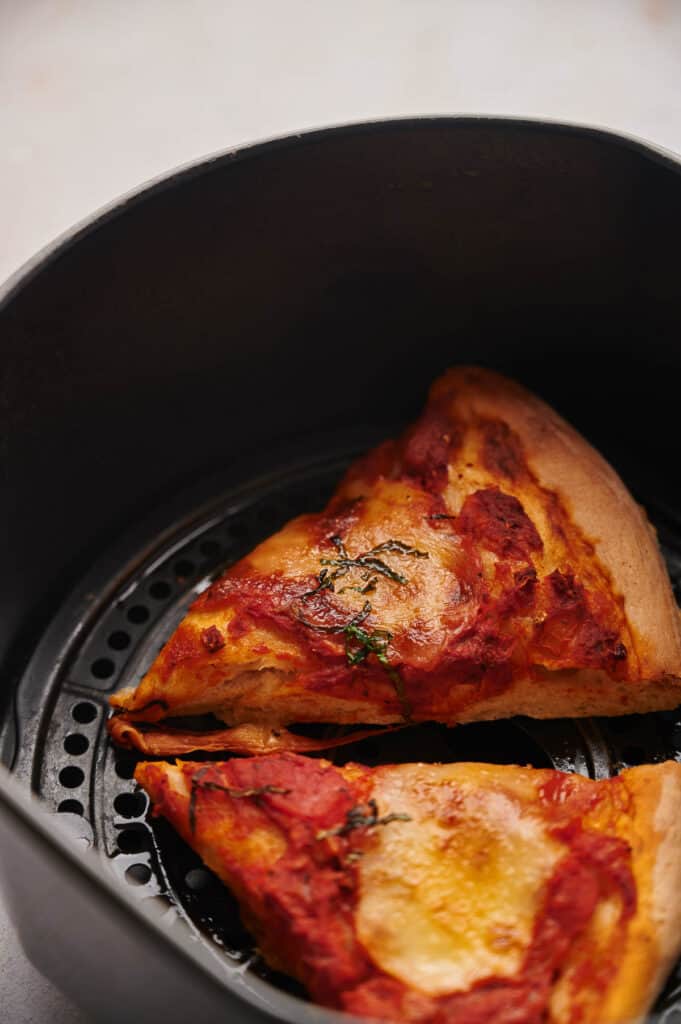 - Add your pizza to the air fryer basket and cook for approximately 3 – 8 minutes, depending on the type of pizza you’re cooking. Check the pizza after 3 minutes to determine if you need to cook longer. Once cooked, remove from the air fryer basket, serve immediately and enjoy!1 Slice Cold pizza