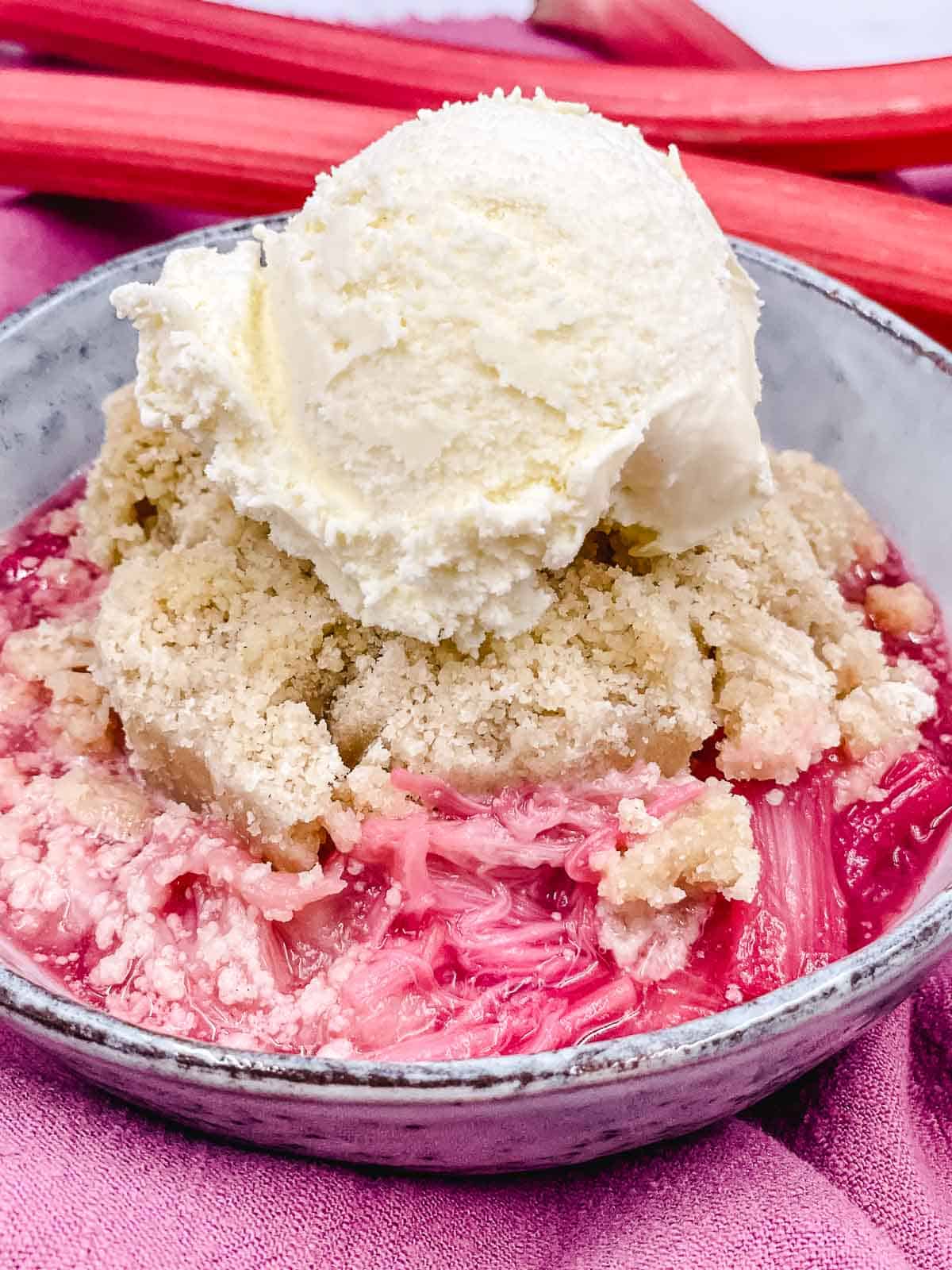 Rhubarb crumble is delicious when served with a scoop of vanilla ice cream, whipped cream, or lashings of fresh custard.