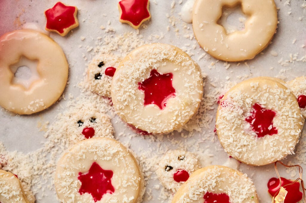 Next, dip the cookie with the hole in the middle into the white glaze, sprinkle some coconut on top for a snowy effect, and then place it on top of the larger cookie. This way, the vibrant red color on the cookie below peeks through, adding a fun pop of color!