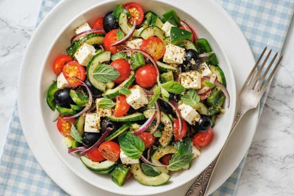 In a large bowl or on a serving platter, layer the cucumber, crisp bell peppers, cherry tomatoes, feta cubes, red onion, and olives. I always reach for my porcelain salad bowl for this because it’s wide enough to toss the bite-sized pieces without spilling, and it looks beautiful on the table.