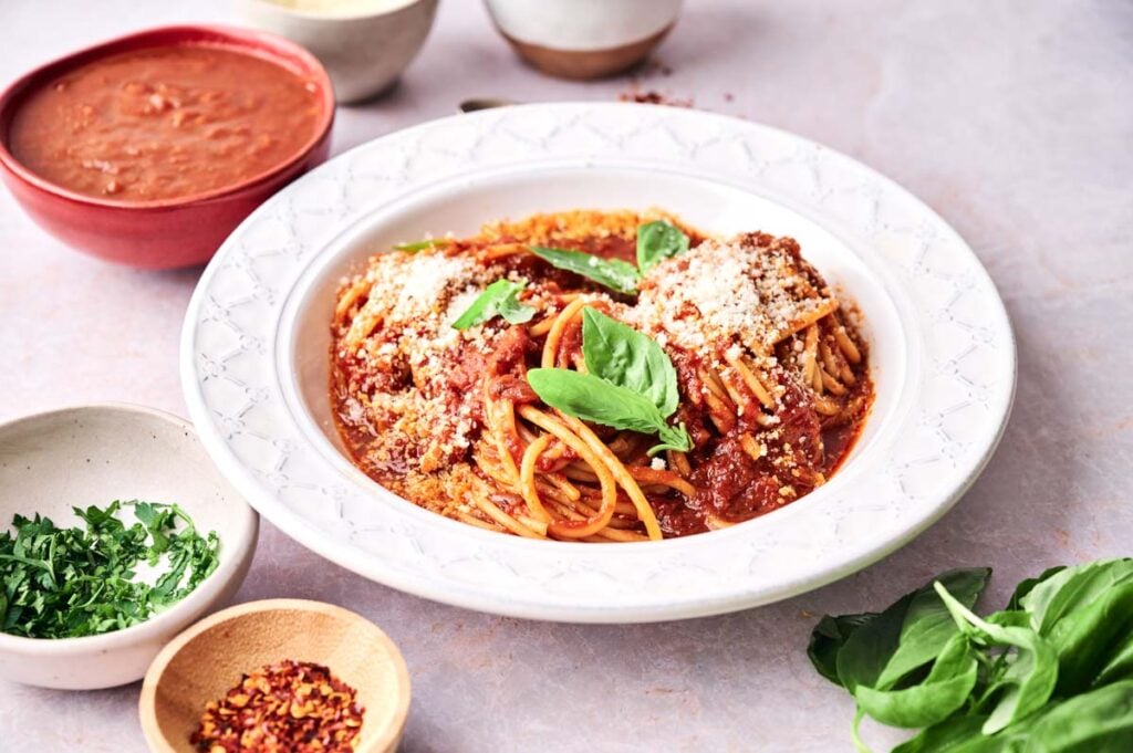 Let the spaghetti cool completely before storing, then transfer it to an airtight container and refrigerate for up to 5 days. When you’re ready to reheat, a splash of water added to the pan over low-medium heat helps loosen the sauce if it gets too thick without drying out the pasta.