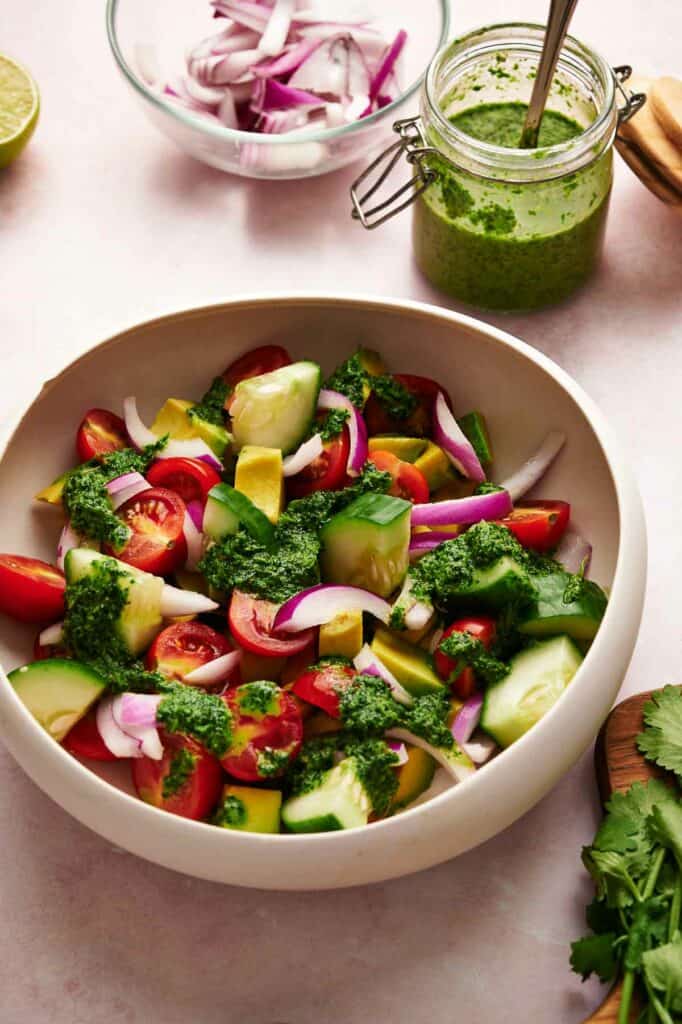 - Add avocado, tomatoes, red onion, and cucumber to a large bowl, add the dressing, and toss to coat evenly. Serve and enjoy.2 avocados, 16 ounces tomatoes, ½ red onion , 1 English cucumber