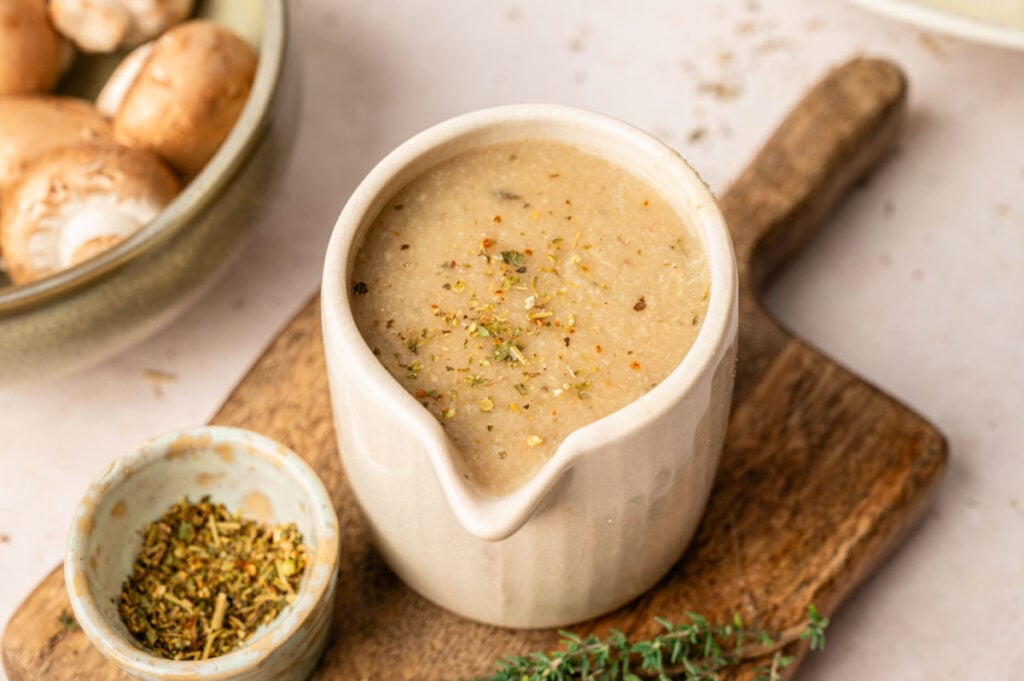 Let the gravy cool completely before transferring it to an airtight container for storage. It’ll stay fresh in the fridge for about 3-4 days, and you can reheat it on the stove over low heat, whisking occasionally to bring back the smooth texture. If it’s too thick after refrigeration, just add a splash of vegetable broth or vegetable stock to loosen it up, or a bit of almond milk if you want extra creaminess.