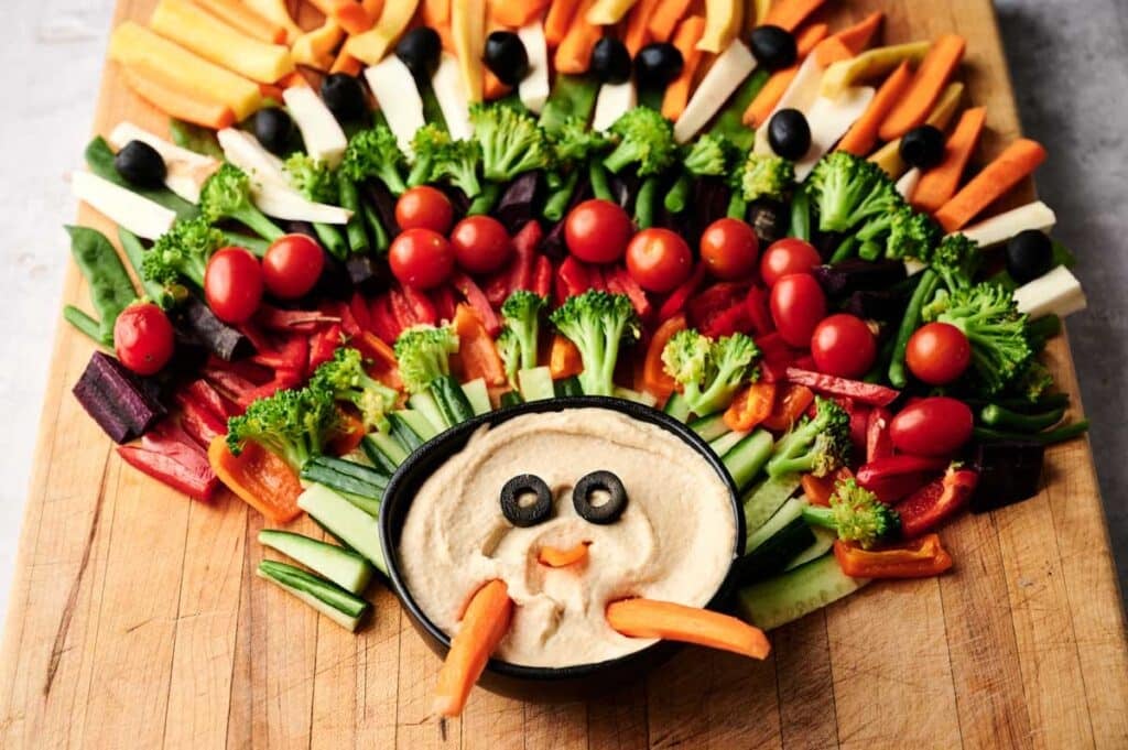 I make this appetizer for Thanksgiving dinner, Friendsgiving, and holiday parties because the colorful presentation always gets compliments. It’s perfect for setting out while guests arrive or between meals. The vegetables can be prepped a day ahead, then everything assembles quickly before serving. The hummus stays fresh at room temperature for 2 hours.