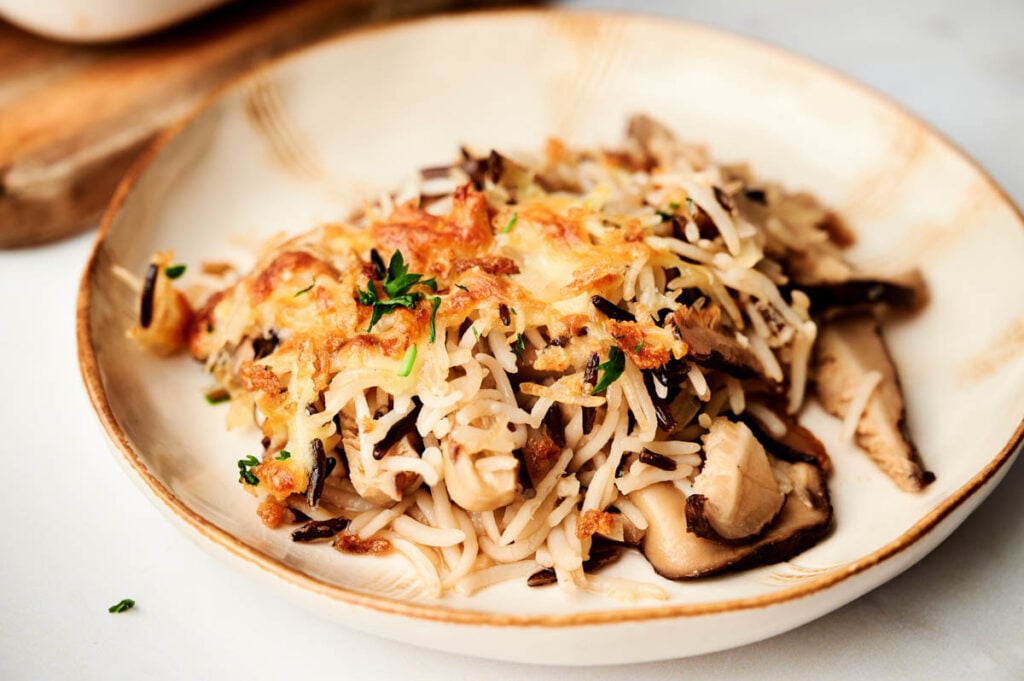 This wild rice casserole recipe will fill your kitchen with the aroma of garlic, caramelized onions, and earthy mushrooms.